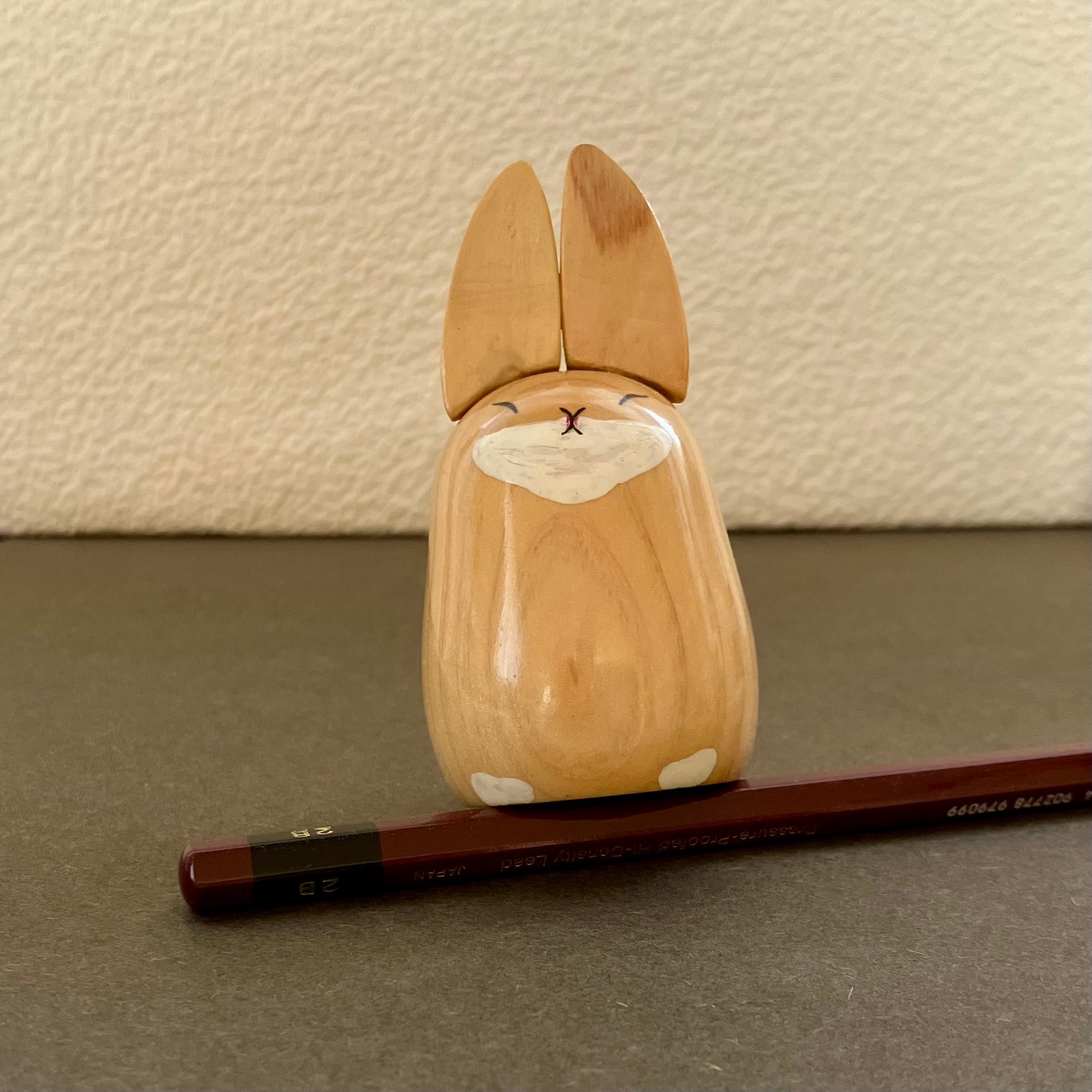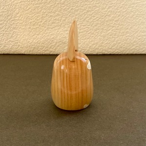 『だっこしてなでて』を求めやすい価格にしたのが『なでてミニ』の立ち位置になります。サイズが小さくても質感が感じられるように作っています。描彩に凝りすぎると こけしらしさ が薄れてしまうため、『だっこしてなでて』同様に最小限の描彩にしつつ、現代らしさを表すべく「立体パーツ」を加えました。頭と胴というこれまでの特有の記号化されたこけし形状とは違うものになることを意識しています。有名なこけし工人であれば、そのネームバリューから 「これもこけし」と分かってもらえるでしょう。でもまだ良く知られていない僕は、受賞した『だっこしてなでて』がベースとなるこの『なでてミニ』こそが、僕の新型こけしの本当の実力が試されている作品であると考えて取り組みました。