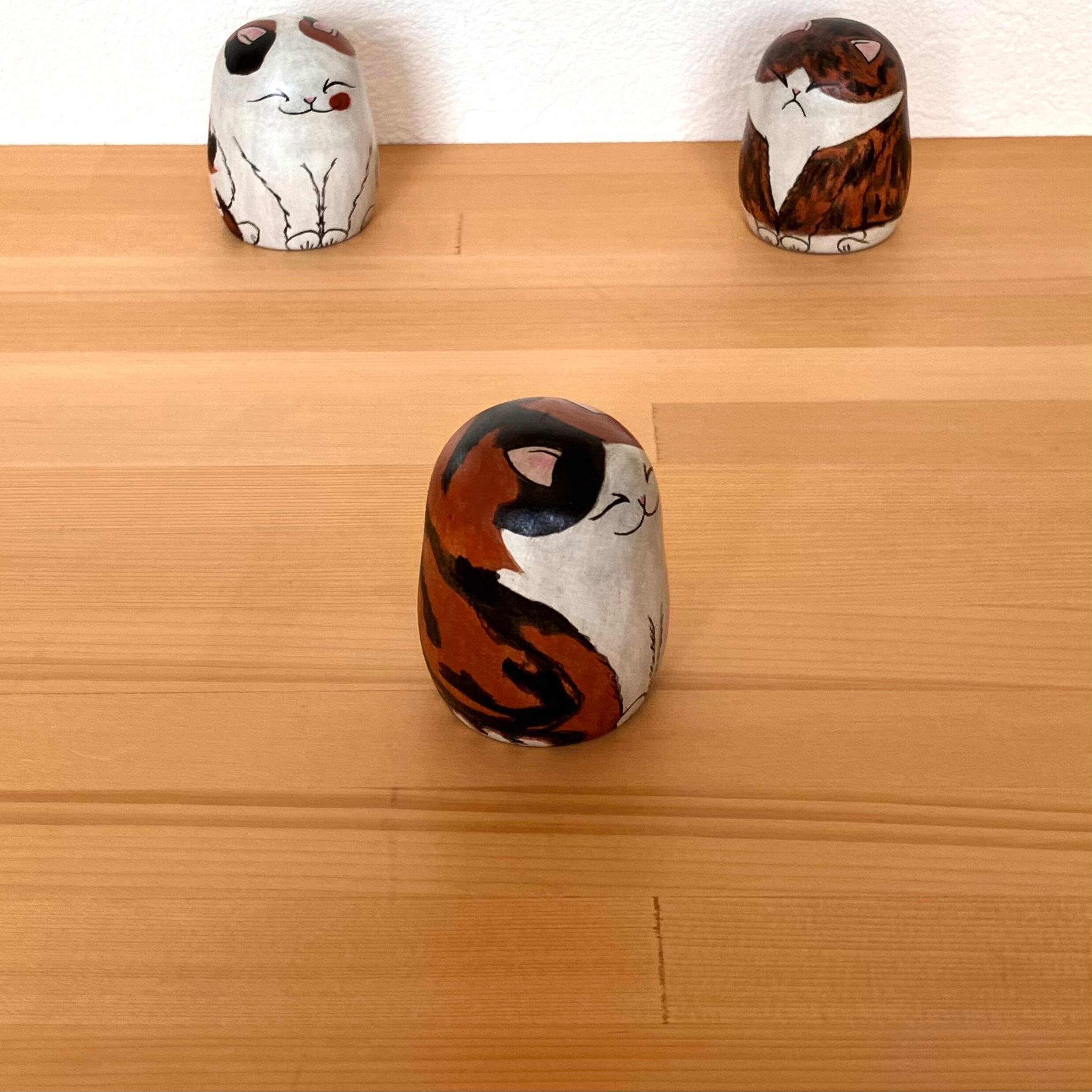 三毛猫のかわいらしさを追い求めての描彩となりました。これまで似顔絵こけしで作った100匹近い猫たちのおかげで出来上がりました。なので、どこかで似た猫ちゃんに出会えるかもしれません。可愛がってあげていただきますようよろしくお願いします。